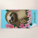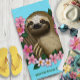 Un lindo perezoso sentado entre flores rosadas sobre un fondo azul