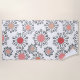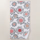 Esta toalla de playa tiene un diseño moderno de mediados de siglo, con flores de círculos en tonos rosas, arándanos, beige y negro.