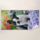 Un perrito femenino lindo joven de Boston Terrier, negro con las marcas blancas, en un jardín florido. Los terrieres de Boston, también llamados los toros de Boston o los "caballeros americanos", son una raza apacible, amistosa e inteligente del perro para el compañerismo. Una foto perrito-observada del perrito tomada por Katho Menden, esta toalla de playa es una idea encantadora del regalo para los amantes del perro. http://www.zazzle.com/kathom_photo usted puede añadir su propio texto presionando el personalizar él botón.