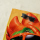 Guay T-Rex Dinosaur vistiendo gafas de sol con una relajante taza de café en un ambiente tropical