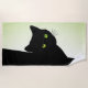 El gato negro pálido con ojos verde esmeralda mira desde detrás de la pared negra hacia una sala verde.