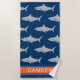 El diseño de toallas de playa personalizadas y muy fresco presenta un fondo azul marino con un patrón oceánico de grandes tiburones blancos de color gris. Añada un nombre o apellido al espacio de texto moderno de todos los personalizados de mayúsculas y minúsculas con un sencillo marco de rayas naranjas.