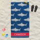 El diseño de toallas de playa personalizadas y muy fresco presenta un fondo azul marino con un patrón oceánico de grandes tiburones blancos de color gris. Agregue un nombre o apellido al espacio de texto moderno de todos los personalizados de mayúsculas y minúsculas con un sencillo marco de rayas rojas.