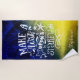 Descanse En Una Toalla De Playa Personalizada De Starfish. Este diseño presenta una puesta de sol azul y amarilla con palmeras.