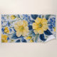 Hermosas flores amarillas y azules cubren esta toalla de playa. Luminoso y alegre, con un aspecto de país francés.