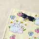 Una toalla de playa con una bella madre y un conejito de bebés de pie juntos. Las margaritas amarillas en el fondo. Unas mariposas extravagantes revoloteando por ahí.