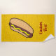 Icono de Hot dog. Iconos de contorno de comida basura fondo de patrón amarillo. Texto personalizado.