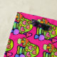 Una estampada de setas con colores psicodélicos. champiñones verdes con corazones rosas, junto a champiñones más pequeños con gradientes rosados púrpura y sombríos naranjas.