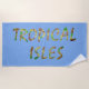 Mosaico, texto gráfico, "Islas Tropicales", que significa, un lugar ficticio, fantasioso -mostrado en un patrón exótico, insular en; naranja, verde oliva, amarillo, taupe, marrón, negro y blanco.