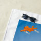 Badhanddoek met opvallende en kleurrijke illustratie in cartoon stijl van een jongen die aan het kitesurfen is. Op de achtergrond is een vuurtoren zichtbaar en een meeuw vliegt boven het tafereel. Illustratie door de Belgische illustrator en cartoonist Stef Ringoot