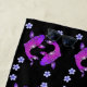 Toalla de playa negra adornada con un pescado de koi morado de estilo oriental rodeado de pequeñas flores. Ofrezco los codazos, el tote y la visera correspondientes.