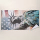La Estatua de la Libertad con la bandera estadounidense detrás de ella.