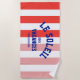 La toalla de playa de la Riviera francesa es perfecta para su escapada... rayas de cabaña rosadas y rojas con letras azules vibrantes de "Le Soleil Vacances". Personaliza con los detalles de tus vacaciones soleadas... año y destino. Perfecto para una visita familiar o de amigos a la playa o destino de soltera o como recuerdo de un viaje pasado. Accesorios de juego disponibles en la colección Le Soleil Vacances Riviera Cabana Stripe Collection.
