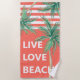 El diseño moderno y moderno de las toallas de playa de palmeras tropicales con nuestro arte de palmeras tropicales pintadas a mano combinado con el moderno y moderno diseño de coral y rayas blancas. "Live Love Beach" se exhibe en un diseño tipográfico de molde moderno. Obra de Moodthology.