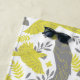 Un loro amarillo iluminado y gris extremo dibujando toalla de playa de patrón tropical. Áreas dibujadas a mano, hojas tropicales y flores en tonos amarillos y grises de moda.