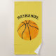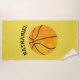 Los niños personalizaron la toalla de playa del amarillo anaranjado de los deportes del baloncesto. Personalice con nombre en fuente negra sobre un naranja grande y baloncesto negro del estilo de la acuarela del vintage. Personalizar para cambiar el fondo amarillo brillante al otro color. Perfeccione para las fans de baloncesto. www.SamAnnDesigns.com