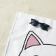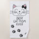 Esta toalla blanca de playa cuenta con un bonito gatito personalizado con una bonita cinta en la cabeza y unas garras de gato. La leyenda de todas las letras dice Mejor mamá de gatos.