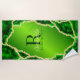 Esta toalla de playa de color verde esmeralda presenta un diseño único que imita las joyas ágata y esmeralda decoradas con purpurinas de oro falso. Las plantillas facilitan la escritura de los nombres First y Family y una letra inicial.