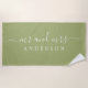 Moda y toalla de playa simple monogramada con el texto grande Mr. y Mrs. en blanco elegante caligrafía manuscrita escrita sobre un fondo verde hoja. Puedes personalizar esta elegante toalla de playa con tu nombre casado. Un regalo perfecto para la pareja recién casada. Diseñado exclusivamente para usted por Happy Dolphin Studio.