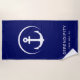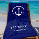 Una toalla de playa moderna de temática náutica azul marino para el barco, con un ilustracion blanco de ancla en círculo. Añade el nombre y la ubicación de tu barco en una tipografía blanca simple.