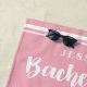 Bachelorette Weekend Beach Toalla rosa y blanca con el nombre de la novia en una plantilla de personalizable y tipografía caligráfica en negrita Bachelorette. Puede agregar más texto ( fecha del evento, nombres de miembros de la fiesta nupcial, etc.) o cambiar el color rosado a otro color mediante la Herramienta de diseño.