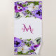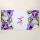 Dos elegantes bordes de flores violeta, de color lavanda, moradas y blancas, cristaleras sobre un fondo transparente. Plantillas para una letra y nombre monograma, letras de color rosa y morado.