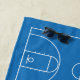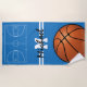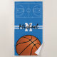 Toalla de playa infantil personalizada con un fondo azul que se puede cambiar a cualquier color, cancha de baloncesto, sus iniciales, nombre y baloncesto.