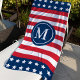 Celebra el 4 de julio y el verano en la piscina o la playa de estilo patriótico. Esta toalla de playa monogramada presenta un diseño inspirado en la bandera de los Estados Unidos de América, con estrellas y rayas de colores clásicos rojos, blancos y azules americanos. Personalice el monograma del personalizado con la carta inicial de apellido de su familia.