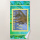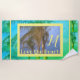 Escena tropical monogramada para los calurosos días de verano. Love the Beach y Monogrammed Initial está escrito en un guión divertido amarillo y soleado dentro de un marco de tres palmeras con frondas soplando en la brisa del océano con cielo azul. El fondo está recubierto de baldosas azules y verdes. Fotografía original y diseño © TamiraZDesigns.