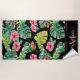 Una toalla de playa floral colorida, muy tropical, con flores exóticas, hibiscos rosas y hojas de palma sobre un fondo negro. Para alegrar tus días de verano donde vayas. Puede hacerlo único añadiendo su propio Monograma y nombre en el menú Personalizar. Puedes contactarme para cualquier ayuda.