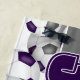 Esta toalla de playa deportiva para jugadores de fútbol tiene un montón de balones de fútbol de tamaño variado morado, gris y blanco que se dan vuelta por todas partes en un fondo blanco de personalizable - personalizable con el nombre y número de camiseta del atleta más nombre de equipo y mascota - por katz_d_zynes