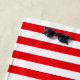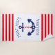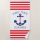Esta toalla náutica de inspiración patriótica tiene un ancla roja, blanca y azul decorada con estrellas y rayas. Las palabras "First Mate" (Primer Destino) están arriba con un nombre que puede personalizar. El fondo es blanco con rayas rojas y blancas en cada extremo. ¡Perfecto para el 4 de julio!