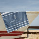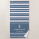 Upgrade your boat gear with this modern personalized beach towel featuring your yacht or boat name in clean white lettering with alternating solid white and nautical rope stripes. A nautical anchor illustration completes this coastal design for new boat owners by Redwood & Vine Design Co.