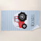Este bonito y moderno diseño de toallas de playa para niños incluye un tractor de granja rojo dibujado a mano con rayas azul pastel y puede ser personalizado con el nombre de su hijo. ¡Perfecto para los pequeños agricultores!