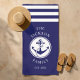 Nombre De Familia Ancla Náutica Trazo De Playa De La Toalla. Toalla de playa azul marino y blanca con un nombre familiar personalizado alrededor de un ancla de temática marina en el centro. Personalízalo con sus detalles familiares y disfrute de sus días de verano en la playa, el lago, la piscina o su jardín trasero.