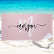 Envuélvete en lujo con la toalla de playa con nombre de monograma femenino de escritura moderna rosa elegante. Esta toalla chic presenta un hermoso fondo rosa con un monograma personalizado en escritura elegante, lo que añade un toque de sofisticación a tu experiencia en la playa o junto a la piscina. Hecha de material suave y absorbente, es perfecta para secarse después de nadar o para tumbarse al sol. El gran tamaño proporciona una amplia cobertura, mientras que el diseño elegante hace una declaración. Ideal para salidas de verano, vacaciones o días de spa, esta toalla de playa combina comodidad y estilo, lo que la convierte en un accesorio imprescindible para cualquier persona que siga la moda en la playa.