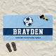 El diseño personalizado de toallas de playa de temática deportiva para niños y adolescentes incluye una pelota de fútbol personalizada con el número de uniforme del jugador, texto personalizado para el nombre o apellido del jugador y texto moderno para el nombre del equipo de fútbol. Es un regalo único para los torneos y los fiestas de billar con el equipo. El diseño es moderno y elegante, con letras de jersey esporádicas y franjas horizontales sencillas. El esquema de color azul claro, marino y blanco se puede modificar para coordinar con los colores del equipo.