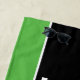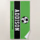 El diseño personalizado de toallas de playa de temática deportiva para niños y adolescentes incluye una pelota de fútbol personalizada con el número de uniforme del jugador, texto personalizado para el nombre o apellido del jugador y texto moderno para el nombre del equipo de fútbol. Es un regalo único para los torneos y los fiestas de billar con el equipo. El diseño es moderno y elegante, con letras de jersey esporádicas y franjas horizontales sencillas. El esquema de colores de verde césped brillante, negro y blanco se puede modificar para que se coordine con los colores del equipo.