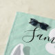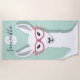 Una toalla de playa con un lama ilustrado que lleva un par de copas de flamencos rosas. El lama se encuentra frente a un fondo de arenque verde claro y el diseño de la toalla incluye un nombre de personalizable y un monograma. El color es blanco, verde claro y rosa.