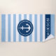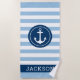 El diseño personalizado de las toallas de playa incluye un diseño náutico con ancla redonda enmarcada de bote y texto personalizado con letras serif sencillas y modernas que se pueden personalizar con un nombre de pila. El diseño del círculo azul marino y el marco de texto contrastan un fondo azul y blanco a rayas con un patrón elegante de rayas horizontales. Los colores y el estilo de fuente se pueden personalizar completamente.