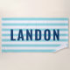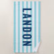 El diseño personalizado de las toallas de playa incluye texto personalizado en letras simples y modernas, todas ellas con un nombre de pila. El texto azul marino contrasta un fondo azul y blanco a rayas con un patrón elegante de rayas horizontales. Los colores y el estilo de fuente se pueden personalizar completamente.