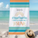 Celebra las vacaciones de verano o la escapada de una chica a la playa con esta divertida toalla de playa que presenta una simple ilustración del sol y las olas del océano, rayas audaces de colores tropicales y dos marcadores de texto personalizables. Agrega un nombre más texto adicional para crear un recuerdo divertido que traerá de vuelta felices recuerdos de vacaciones cada vez que alcance esta toalla.