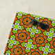 "Brightly colored towels and washcloth with intricate geometric patterns in orange, green, and blue. The vibrant design adds a lively, artistic touch."