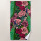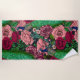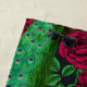 Patrón dibujado a mano con pavos reales y varios rosas sobre un fondo oscuro