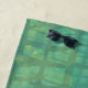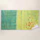 Un cuadro de arte paisajístico amarillo y verde en verde y amarillo de un prado o campo lleno de flores silvestres con un bosque de pinos en el horizonte. Arte original de Nic Squirrell.