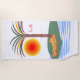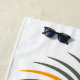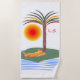 Toalla de playa con mi original y simple pero colorido diseño vectorial de una palmera, sol naranja brillante y olas, con iniciales de personalizable.