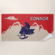 Manténgase fresco incluso en un día caluroso en la playa con esta toalla y su fresco gráfico de temática invernal. Esta toalla de playa tiene un ilustracion de estilo vintage de moto de nieve y jinete de azul marino con un fondo de montañas color crema o marfil sobre un fondo rojo. Está listo para ser personalizado con un nombre en letras de color crema y azul.