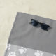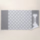 Esta toalla de playa tiene un patrón de huellas de perros blancos en color gris. La parte superior e inferior tienen bordes grises más oscuros. En la parte inferior también hay una silueta de hueso de perro blanco con un área de texto personalizable para un nombre.