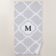 Toalla de playa gris con un patrón blanco marroquí de quatrefoil y monograma personalizado en el centro.