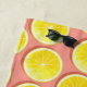 Un patrón de rodajas de limón fresco y jugoso en tonos vivos y vivos de amarillo, con una textura acuarela que le da ese aspecto recién cortado. Están colocadas sobre un fondo color salmón rosa para dar un aire luminoso y veraniego, como una limonada rosa.